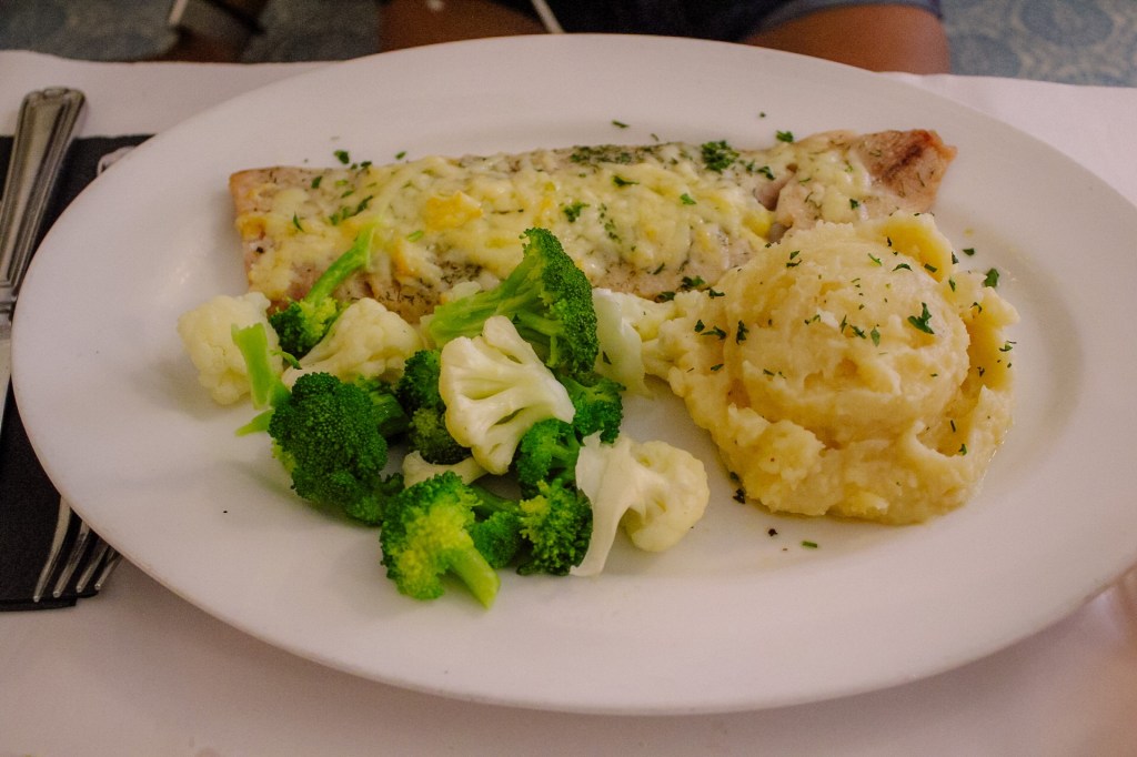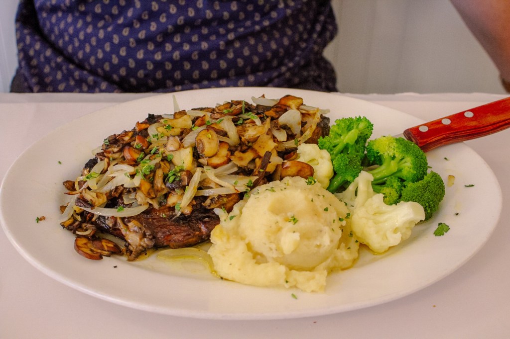 Getting food at the hotel was so convenient and an unexpected bonus. Our room was located on the main floor, so the restaurant was very easy to locate. Quite honestly, the food was my favorite part! I ordered the Parmesan crusted Whitefish with a side of steamed vegetables. Sean ordered the steak dinner, which came smothered in onions + mushrooms, with a side of steamed vegetables. We loved each and every bite we took at The Hotel Frankfort & Restaurant! The staff were so helpful and friendly.