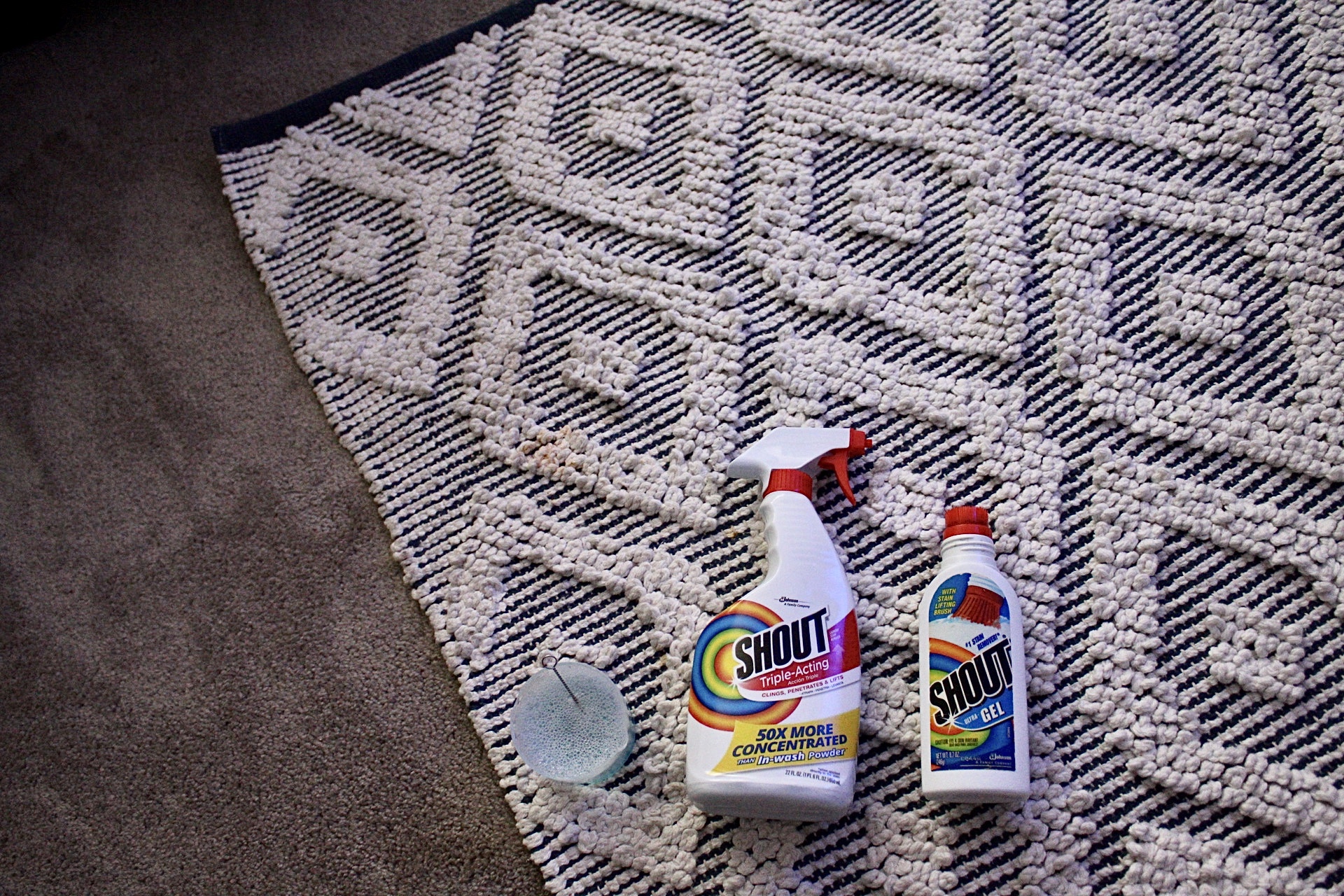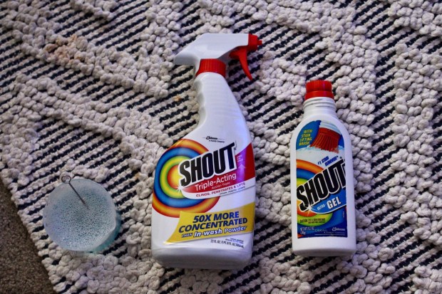 I sprayed the Shout on top of each stain until they were drenched. After letting the stains soak, I used the straw cleaner to lightly scrub the yearn. It’s important to be gentle with your textured rug to avoid pulling out yarn which is why I chose to go with something on the softer side.