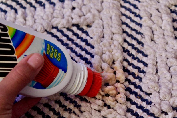 As I went on, I dipped the straw cleaner in the clothes detergent + water mix to help get the Shout out and assist with cleaning the rug’s stains. This is also a good time to use a little bleach cleaner spray to get the yarn/stain back to white if that happens to be the color of your rug!