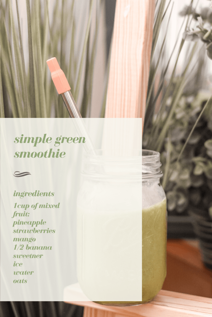 Now, here’s the quick and easy green smoothie that boosts my mood and creativity! I totally threw this together one morning and thought it was deliciously filling. The oats really help the “filing” department, in my opinion. I also like adding chia seeds, flax seeds, etc. but I’m in the process of moving and don’t have all of my go-to ingredients anymore. We’re trying to stay far away from the grocery stores as much as possible (at least until we move, lol).