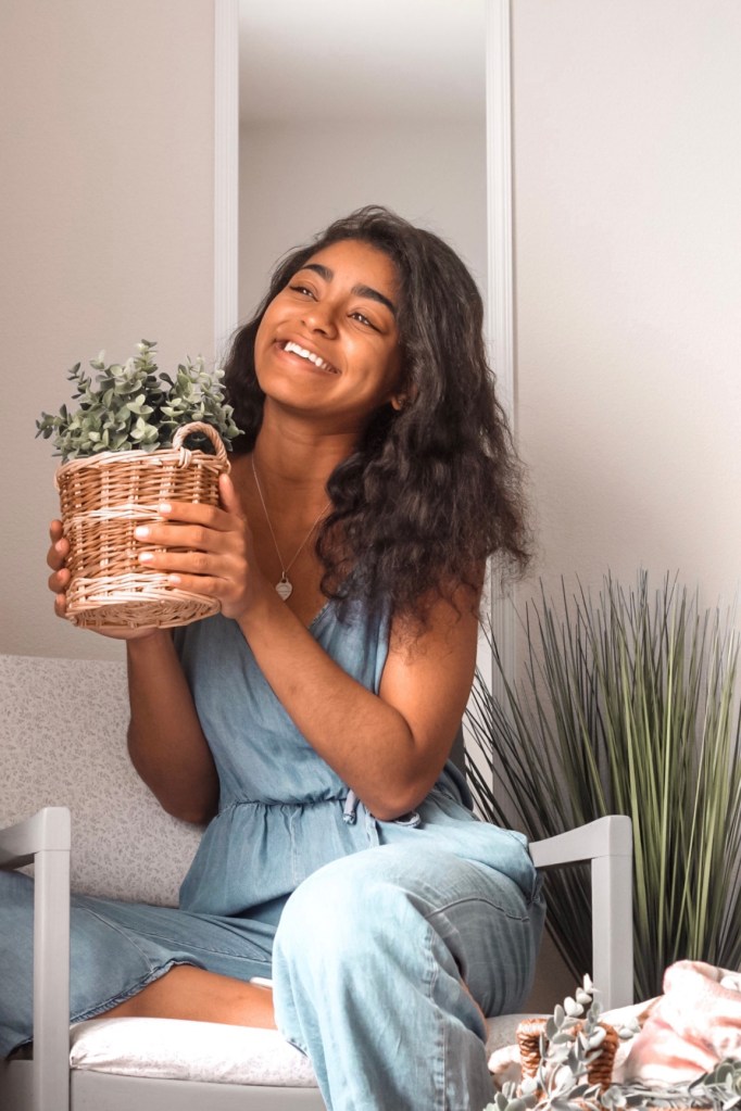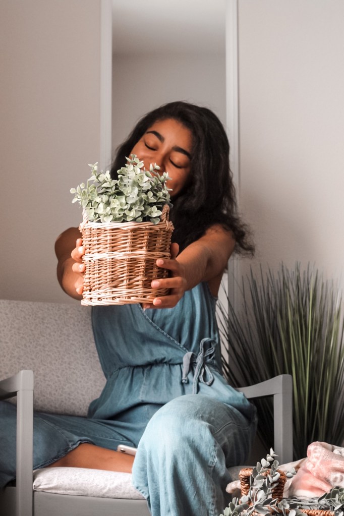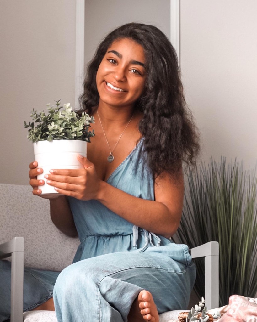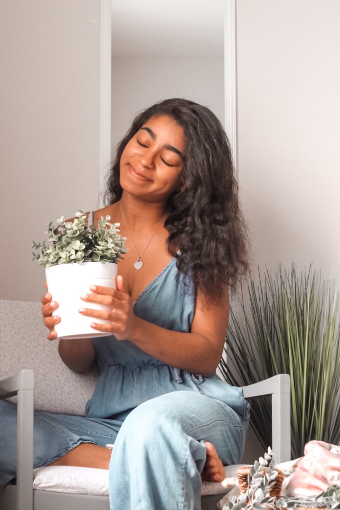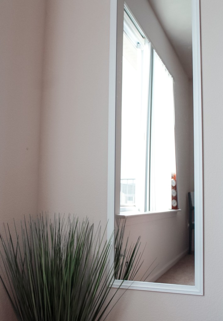 Our new bedroom is a ton more spacious than our old room– we even have an attached full bath and walk-in closet! To decorate, I believe I spent under $30 total to style this room. So far I’ve purchased this $6 mirror from Walmart, in white. I also reupholstered my chair and painted it to match our new dresser color. I went with a light grey and love how it all turned out! The paint, fabric, and tools totaled up to around $20. Of course I reused some of our old decor to style empty corners and other elements of the room. If you read my posts in the past, you may have noticed how much I enjoy adding plants to my space because of the positive impact on my day and overall mood. I’m still standing by that belief!