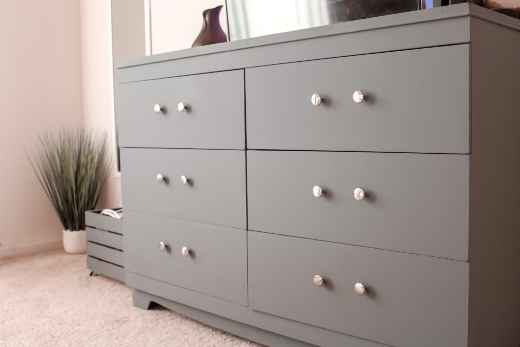 I find it amazing how easy it is to make an old piece of furniture look like new. I still need ideas for canvas art above our bed. I plan to paint them myself, so if you have any ideas (simple abstract) let me know! Eventually, I will be decorating our main bathroom– so stay tuned for those updates! What’s next? We hope to find a rug, a new nightstand eventually and a few more things will be hung up on our walls.