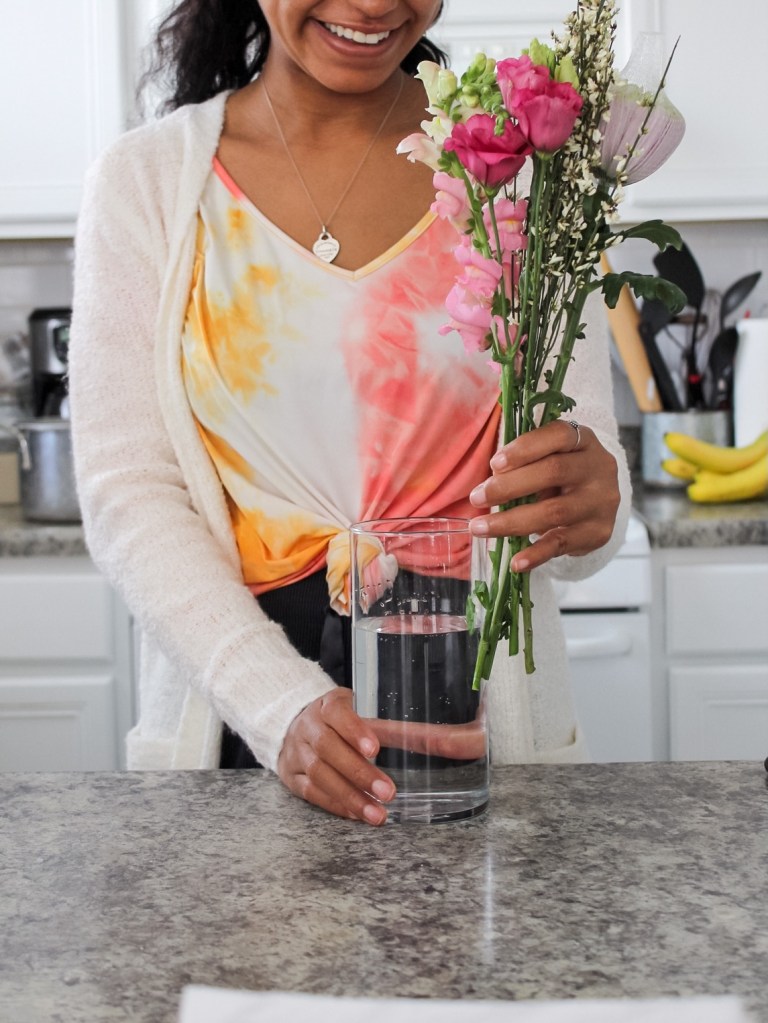 - Play around with your flowers in the vase(s) before adding water, cutting, etc. This helps overcutting and helps paint a picture of how your vase(s) will look in the end.